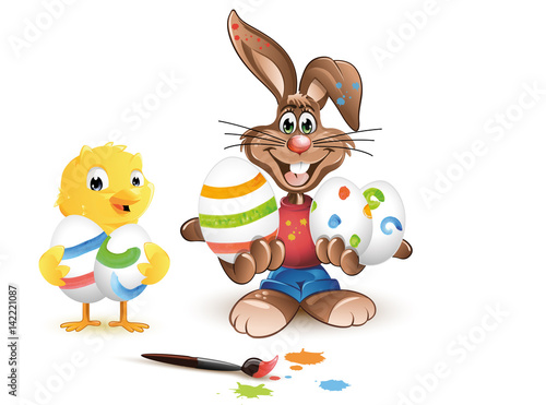 The vector illustration "Osterhase und Kücken zeigen bemalte Ostereier" from Matthias Enter is available on Fotolia under a royalty-free license from 1 credit (Credit from R 6.38).