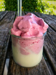 Gefrorene Früchte (hier Himbeeren) mit Kichererbsenwasser (ohne Salmonellengefahr und vegan) oder mit Eiweiß einfach aufschlagen - schon ist das superfluffiges Softeis fertig!