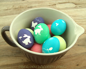 Lustig, ich hatte diese Woche auch diese "Tuch-Eierfarben" schon fast im Einkaufswagen, hab mich dann aber trotzdem wieder für die traditionelle Variante entschieden mit den Zwiebelschalen zu färben. Eure bunten Eier mit den weissen Aufkleberchen sind aber toll geworden.