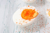 Die halben Eier mit Olivenscheiben, fein aufgeschnittener Paprika und etwas Dill garnieren.