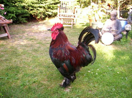 Wenn möglich, sollte ein Hahn bei den Hühnern sein. Es ist besser, wenn dieser Hahn älter als die Hühner ist. Zum Beispiel hat ein Hahn, der bereits 2 Jahre alt ist, mehr Erfahrung und noch immer eine gute Lebenserwatung. Warum überhaupt einen Hahn und dann auch noch einen älteren? Ein Hahn bringt sehr viel Ruhe in das Sozialleben der Herde. Er bewacht und beschützt die Herde. So gibt er z. B. Warnlaute von sich, wenn sich ein Greifvogel nähert. Er schlichtet auch Streitigkeiten unter den Hennen. Und da hat ein erfahrener Hahn natürlich jede Menge Vorteile gegenüber einen unerfahrenen Hahn, der das im Grunde zwar alles kann, aber erst lernen muss seine Fähigkeiten sicher zu beherrschen und sich dann auch noch gegen die gleichaltrigen Hennen durchsetzen muss. Ein Älterer Hahn hat es da durch seine Größe und Erfahrung erheblich leichter. Ein erfahrener Hahn nimmt dem neuen Hühnerhalter sehr viel Arbeit und Sorgen ab und ist durch nichts zu ersetzen.