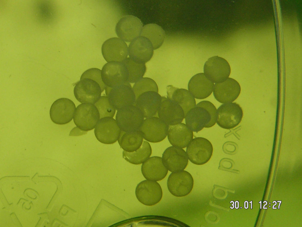 Spätestens zwei Stunden nach der Eiablage kann mit dem Absammeln der Eier begonnen werden. Eier, die jetzt noch bei Berührung platzen, sind unbefruchtet oder hätten sich nicht weiter entwickelt. Ich gebe bis zu 70 Eier in eine gründlich gereinigte Plastikschale (L20xB10xH7cm) mit abgestandenem Frischwasser, das die gleichen Werte, wie das Aquarienwasser haben soll.